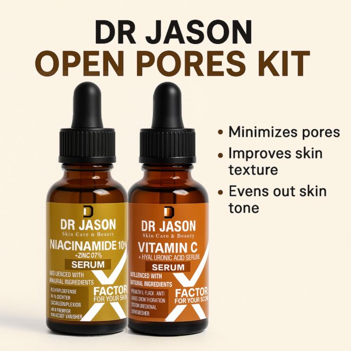 Transform your skin with Dr. Jason Open Pores Kit (Niacinamide Serum & Vitamin-C Serum) — the ultimate pore-refining and glow-boosting solution for clear, smooth, and radiant skin.